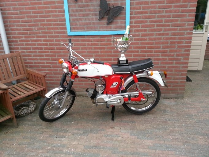 Deze brommer, die in het bezit is van mij, heeft de prijs voor de mooiste brommer van Delft gewonnen.