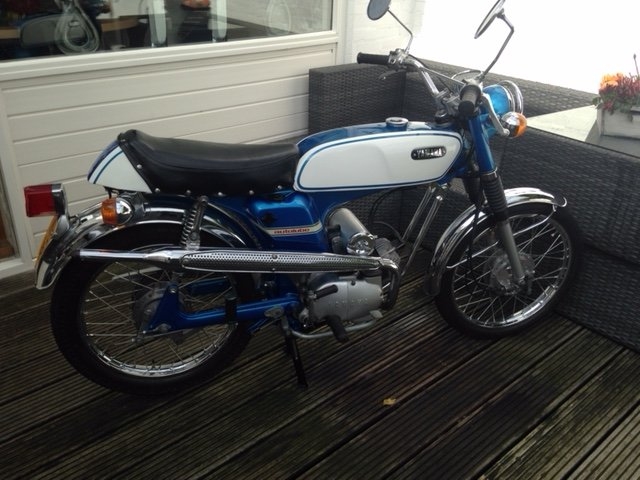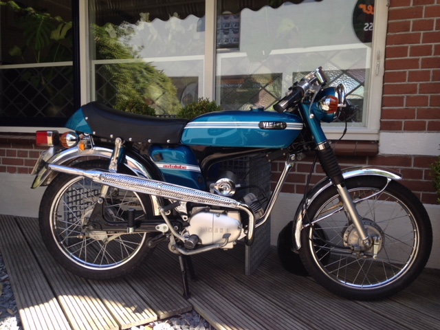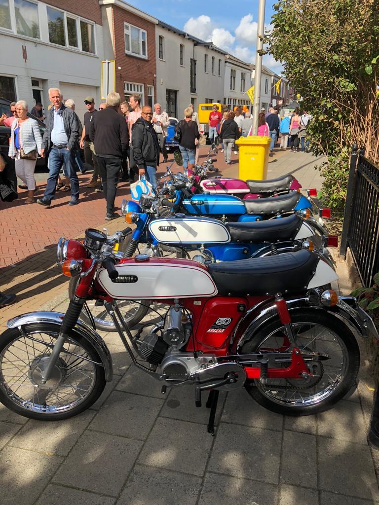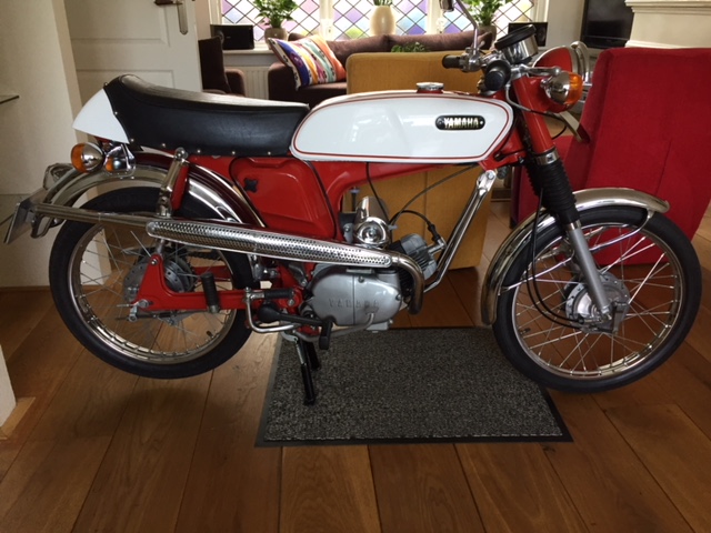 In de jaren 70 ben ik in aanraking gekomen met de Yamaha fs1. Ik werkte bij een hoveniersbedrijf en wij deden o.a het tuinonderhoud bij Hans Moerkerk. Hij was toen de importeur van Yamaha en hij was de man die de Yamaha bromfiets naar Nederland haalde en na een bezoek in Rotterdam waar hij toen zat als importeur was ik verkocht. In de jaren die daarop volgde heb ik verschillende modellen gehad, deze oude modellen tot 1973 ben ik sinds een jaar of 5 weer aan het verzamelen. Op het moment heb ik 4 Yamaha’s, rood/witje uit 1969, een blauwwitje uit 1970, een blauwe Street uit 1972 en een paarse 378 uit 1973.
