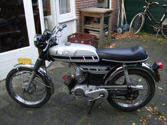 Ik heb een Yamaha fs1 1J5 uit 1977. Ik heb de brommer gekocht op mijn 16de, omdat dit mijn droom brommer was/is. Voor die tijd mocht ik van mijn ouders geen schakelbrommer en moest ik genoegen nemen met een Mobylette. Na een jaar op de FS1 gereden te hebben moest er teveel aan gebeuren en wegens tijd en geld gebrek is m'n FS1 helaas is de schuur beland. Nu na meer dan 7 jaar wil ik hem weer in orde maken zodat er weer lekker op getoerd kan worden.