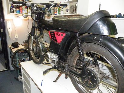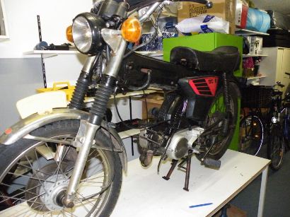 Enkele onderdelen zoals achterspatbord, koplamp, eitje, buddyseat en nog een paar kleine onderdelen zijn vervangen door nieuwe “imi“onderdelen. Voor de rest zijn tank en zijkappen opnieuw gespoten en voorzien van nieuwe stickers. Nadien is de brommer opnieuw gekeurd en voorzien van een kenteken.
